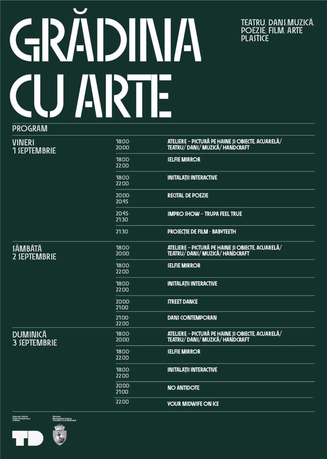 Casa de Cultură „Traian Demetrescu” deschide în perioada 1-3 septembrie 2023 Grădina cu Arte, un eveniment captivant care va avea loc pe Esplanada Teatrului Național „Marin Sorescu” și Bulevardul A.I.Cuza. Evenimentul își propune să ofere participanților o experiență unică de explorare artistică prin ateliere de pictură, ateliere de dans, ateliere de muzică, ateliere de teatru, ateliere handcraft, proiecții de film, spectacole live și concerte.