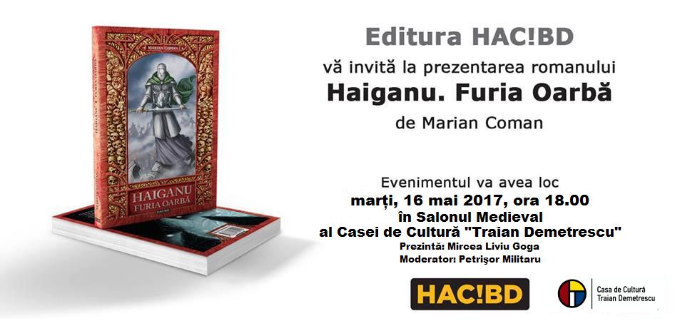 Casa de Cultură Traian Demetrescu din Craiova vă invită marți, 16 mai 2017, începând cu ora 18:00, în Salonul Medieval la lansarea cărții „Haiganu. Furia Oarbă” de Marian Coman. Cartea va fi prezentată de Mircea Liviu Goga, iar întâlnirea va fi moderată de Petrişor Militaru. Aventura Zeului Osândit continuă în ”Furia Oarbă”, al doilea volum dintr-o trilogie fantasy tulburătoare La un an și jumătate de la apariția romanului ”Fluviul Șoaptelor”, Editura HAC!BD publică ”Furia Oarbă”, cea de a doua parte a seriei ”Haiganu”, o trilogie fantasy de extracție românească ce poartă semnătura lui Marian Coman.