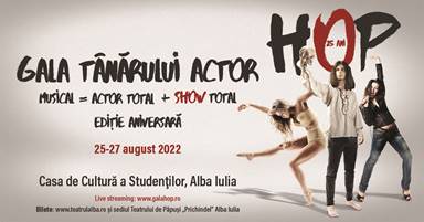 Ediția cu numărul 25 a Galei Tânărului Actor HOP are loc la Casa de Cultură a Studenților din Alba Iulia în perioada 25-27 august și va fi transmisă live pe site-ul Galei HOP https://galahop.uniter.ro/ de roEvents. Evenimentul este organizat din 1998 de UNITER și a avut de-a lungul vremii susținători instituționali și financiari fără de care nu ar fi ajuns aici. Mulțumim pe această cale tuturor partenerilor care au avut grijă ca HOP să crească frumos!
