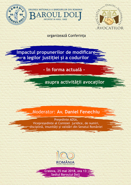 Baroul Dolj în colaborare cu Asociația pentru Dialog și Solidaritate a Avocaților – ADSA, organizează vineri, 25 mai 2018, începând cu ora 13.00, la sediul Baroului Dolj, Conferința cu tema ”Impactul propunerilor de modificare a legilor justiției și a codurilor – în forma actuală – asupra activității avocaților”.