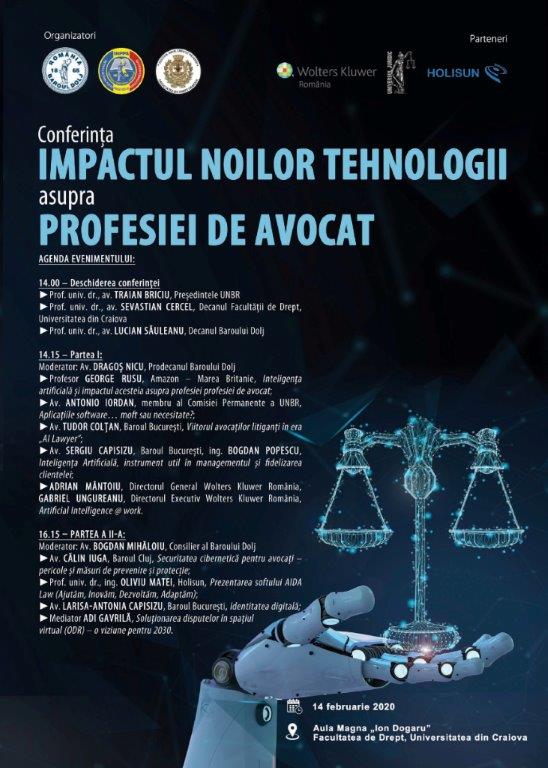 Baroul Dolj organizează vineri, 14 februarie 2020, ora 14.00 în Aula Magna „Ion Dogaru” a Facultății de Drept din Craiova, Conferința ”Impactul noilor tehnologii asupra profesiei de avocat”.