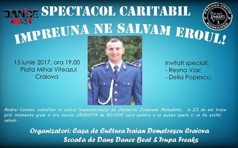 Casa de Cultură “Traian Demetrescu”, Şcoala de Dans Dance Beat şi FREAKS organizează joi 15 iunie 2017, ora 19.00, în Piaţa Mihai Viteazul spectacolul caritabil de dans şi muzică “Împreună ne salvăm eroul” pentru Andrei Cosmin.