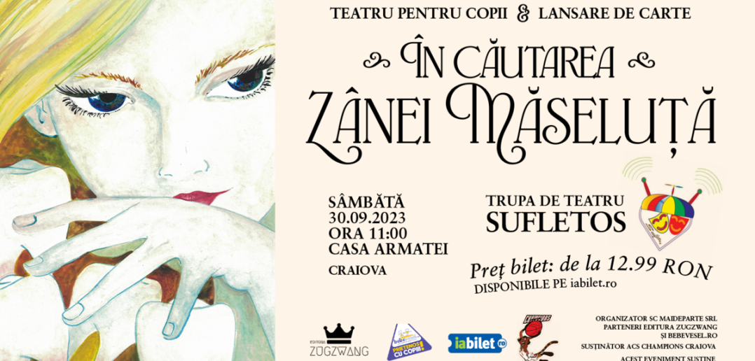 Editura Zugzwang şi Bebevesel te invită la o nouă aventură sâmbătă, 30 septembrie, la orele 11.00, la Casa Armatei din Craiova. Pregătim un spectacol de teatru muzical pentru întreaga familie, adaptat după noua carte pentru copii, cu titlul ”În căutarea Zânei Măseluță”, de Andreia Birtu cu ilustrații de Ioana Fluerașu. Interpretarea şi muzica sunt asigurate de către Anca Grosu şi Ioana Rizea, adică Trupa Sufletos din Bucureşti.