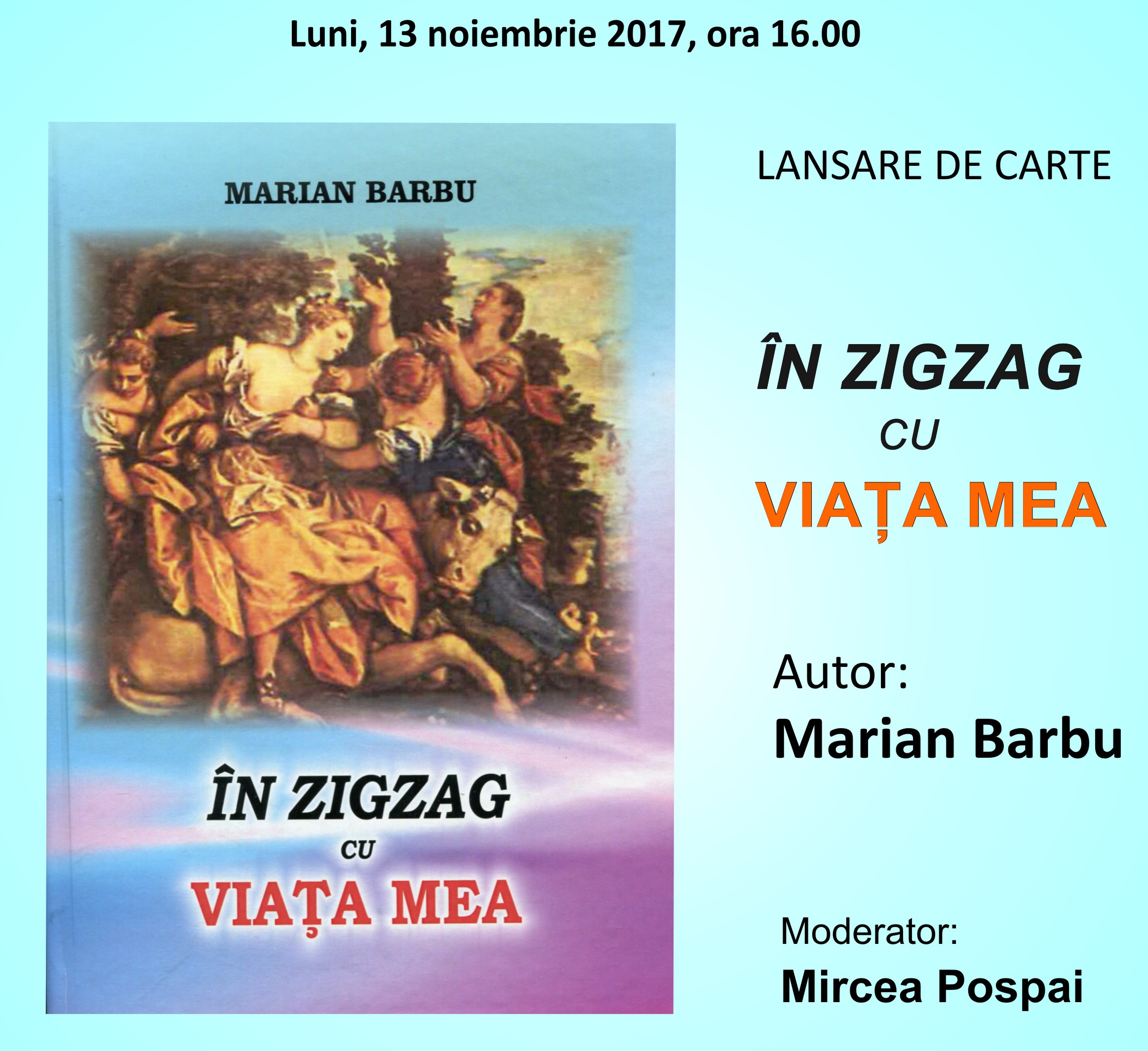 Biblioteca Județeană “Alexandru și Aristia Aman” organizează luni, 13 noiembrie 2017, începând cu ora 16.00, lansarea volumului „În zigzag cu viața mea”, autor Marian Barbu.