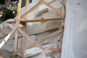 vedeți, nu mai putea să reziste în felul acesta, pentru că tot placajul ei este deteriorat și căzut. La început, am vrut să facem doar o reparare a statuii și, pentru intervenție asupra ei, trebuia să intrăm în toate aceste avize de la Cultură. Am primit observații de la comisia de monumente de cultură și istorice că există o disproporție între statuie și soclul său. Am văzut și discrepanța între interiorul parcului și această intrare principală și atunci am luat hotărârea să aliniem piațeta, cu totul, la nivelul de modernizare și de refacere a tot ceea ce a fost în parc. Deci piațeta va fi refăcută în totalitate, cu materiale asemănătoare cu cele din parc. Toate trebuie să țină cont de acest monument istoric, pentru că și statuia face parte din acest ansamblu, fiind în apropierea zonei de protecție a monumentului istoric. Se va reface soclul, într-o proporție de 1,5 metri