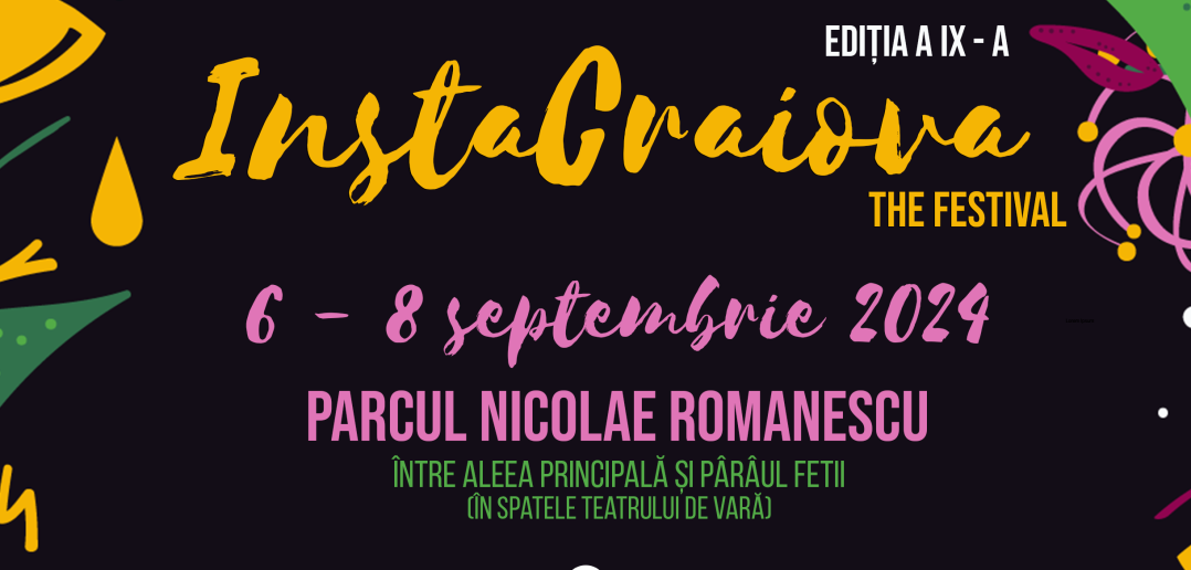 Între 6 și 8 septembrie 2024, Parcul Nicolae Romanescu (între aleea Principală și Pârâul Fetii, în spatele teatrului de vară) devine locul de întâlnire al tinerilor creativi, în cadrul Festivalului InstaCraiova, aflat la ediția a IX – a. Ne așteaptă 3 zile de festival cu ateliere, sesiuni de fotografie, seminare, expoziții, momente artistice și muzică.