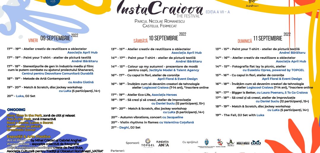 Începând de vineri, 9 septembrie, până duminică, 11 septembrie, în Parcul Nicolae Romanescu, zona Castelul Fermecat, are loc InstaCraiova, The Festival, ediția a VII – a, trei zile creative, cu ateliere, seminare, expoziții, muzică, zone interactive și de relaxare.