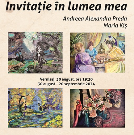 Centrul Judeţean pentru Conservarea şi Promovarea Culturii Tradiţionale Dolj vernisează vineri, 30 august 2024, ora 19:30, la Galeriile „Cromatic“, expoziția „Invitație în lumea mea“, realizată de Andreea Alexandra Preda și Kiș Maria, două tinere talentate și speciale, care acum, la 25 de ani, se aventurează cu emoție în deschiderea primei lor expoziții în lumea artelor vizuale.
