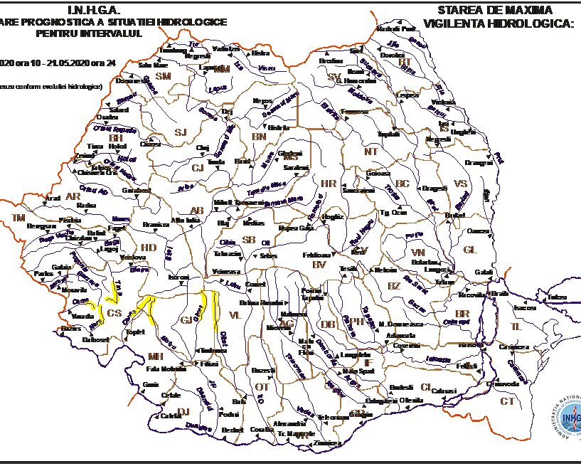 În intervalul 21.05.2020, ora 10:00 – 21.05.2020, ora 24:00, pe râurile din bazinele hidrografice: Timiș – bazin superior, Caraș – bazin superior, Nera – bazin superior, Cerna – bazin superior și afluenți bazin mijlociu (judeţele Caraş-Severin şi Gorj), Jiu – afluenții aferenți sectorului aval S.H. Sadu – amonte S.H. Rovinari, Gilort – bazin superior, Motru – bazin superior și afluenți bazin mijlociu (judeţele Gorj şi Mehedinţi), Olteţ – bazin superior, Olt – afluenţii de dreapta aferenţi sectorului aval confluenţă Lotru – amonte Ac. Ionești (judeţele Vâlcea și Gorj).