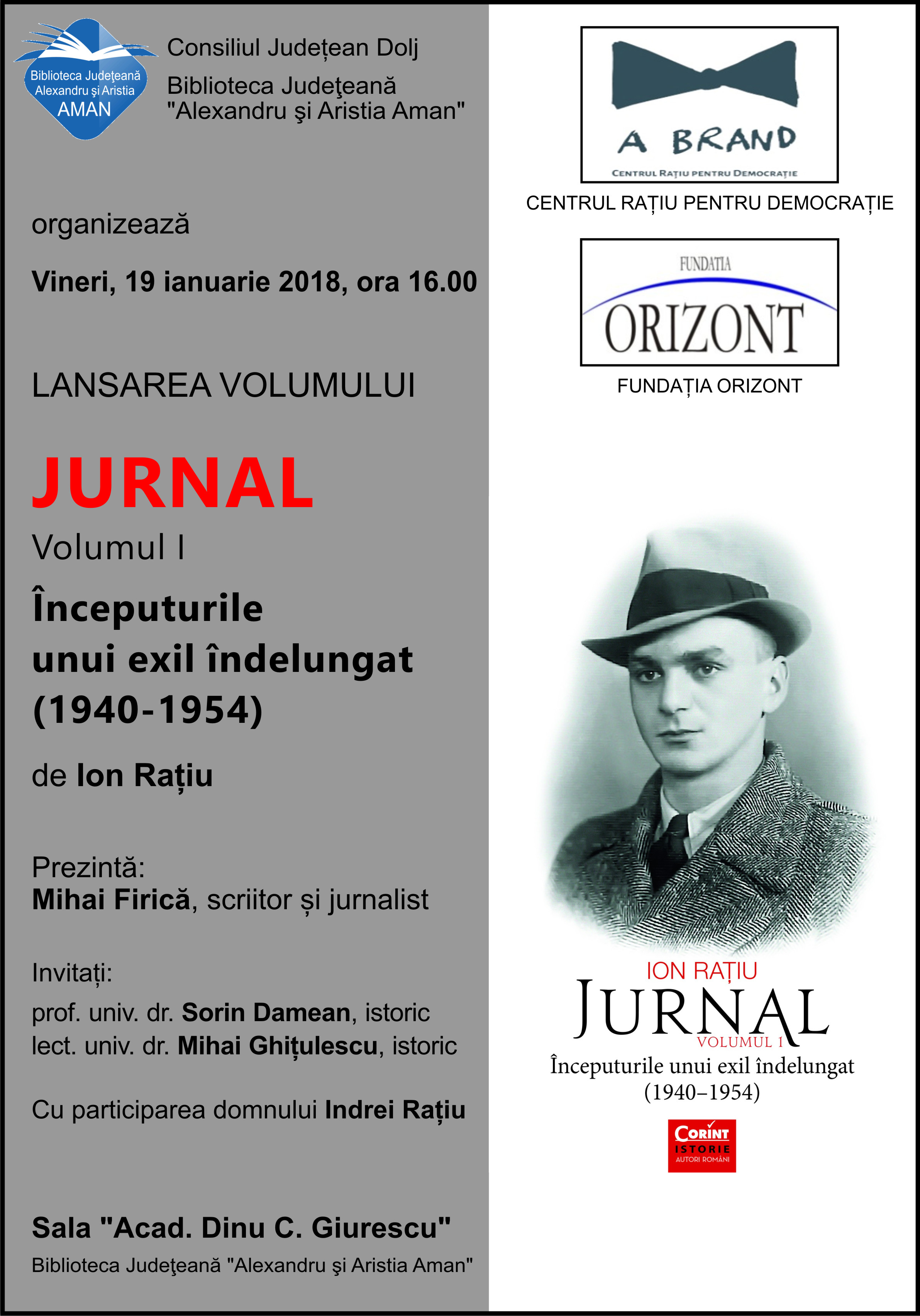 Biblioteca Județeană “Alexandru și Aristia Aman” găzduiește, vineri, începând cu ora 16,00, lansarea volumului Jurnal. Volumul I. Începuturile unui exil îndelungat (1940 – 1954), de Ion Rațiu.