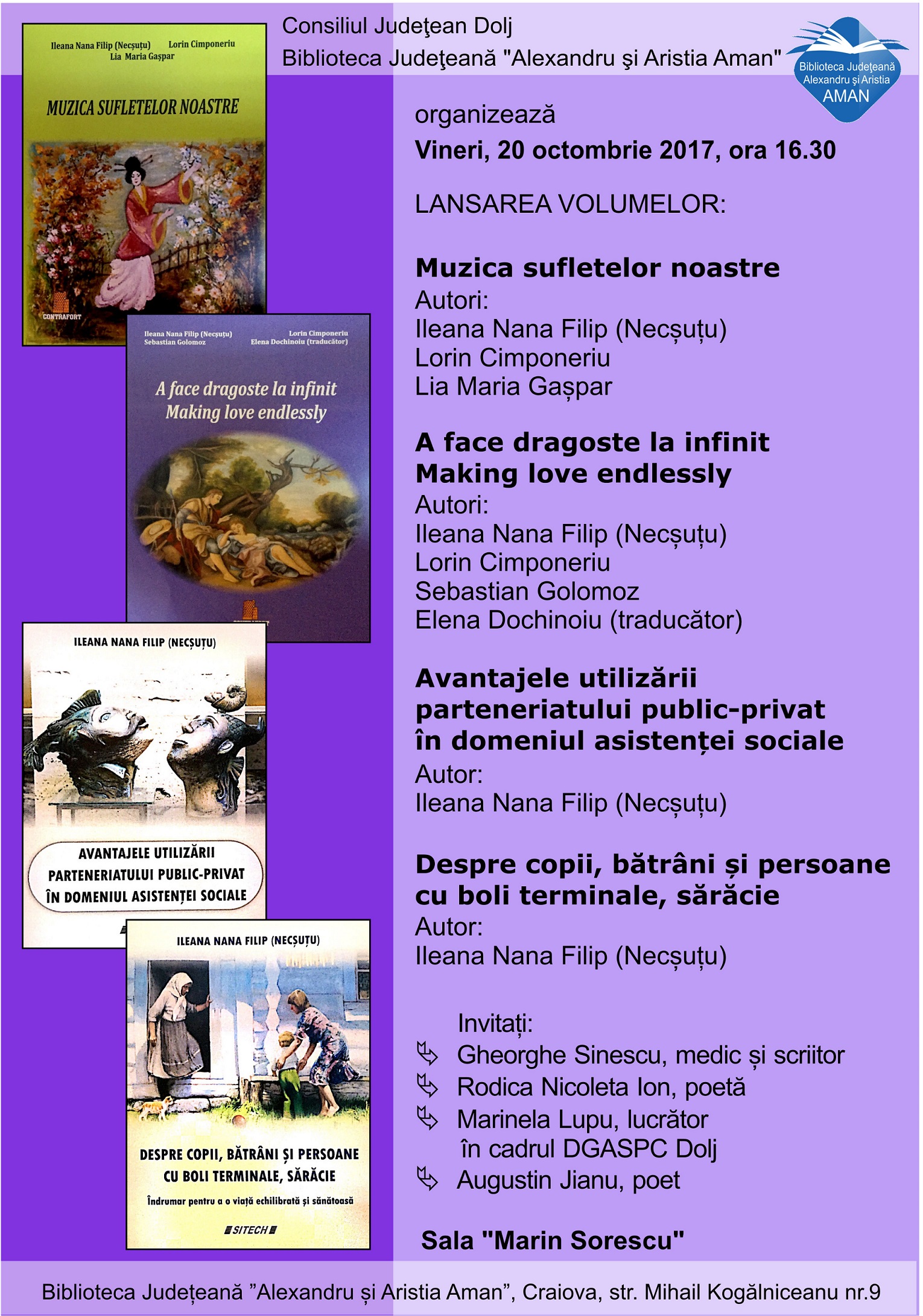 Biblioteca Județeană “Alexandru și Aristia Aman” organizează vineri, 20 octombrie 2017, începând cu ora 16.30, lansarea următoarelor cărți: