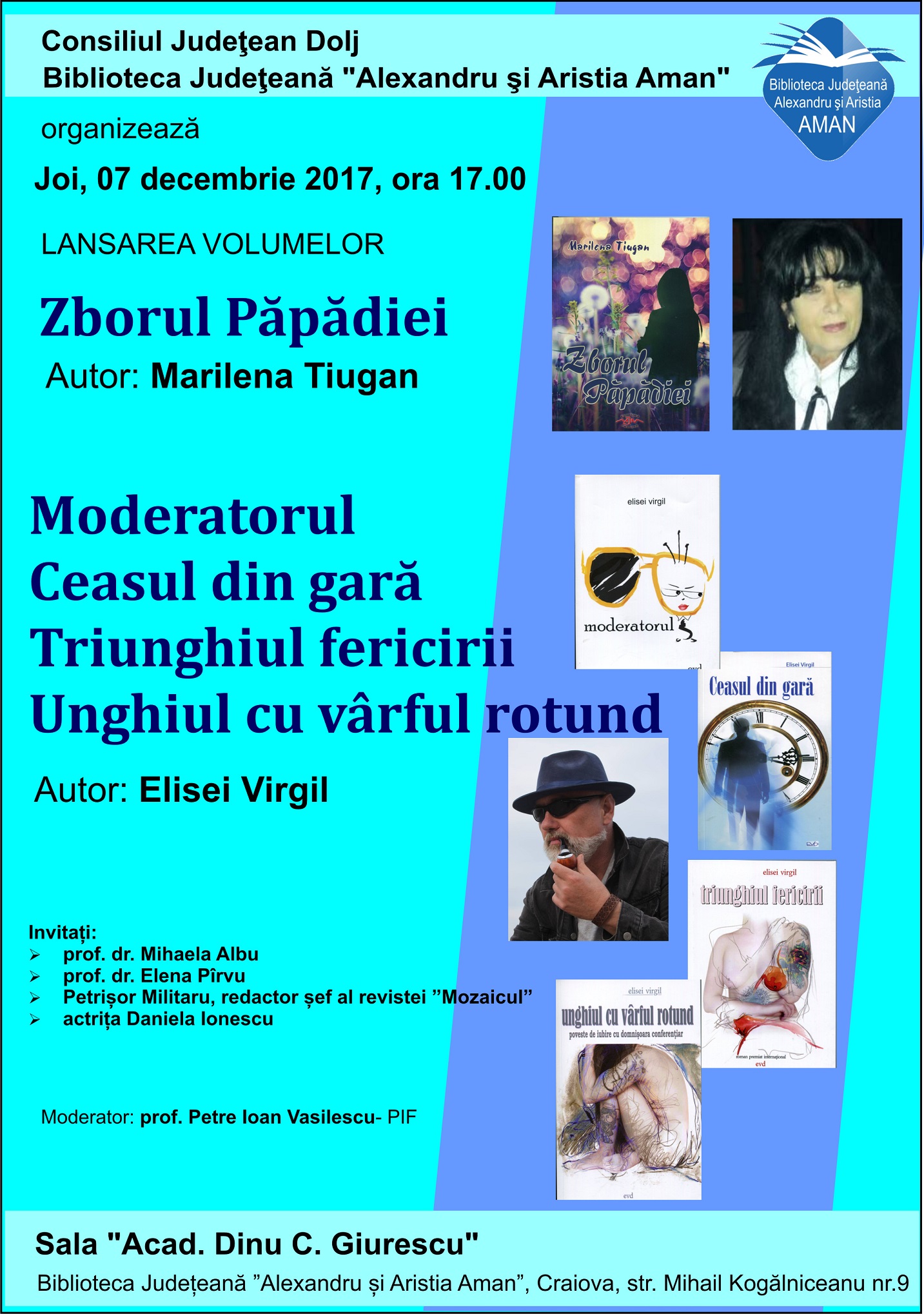 Joi, 7decembrie, începând cu orele 17,00, Biblioteca Județeană “Alexandru și Aristia Aman” organizează lansarea volumelor „Zborul păpădiei”, autor Marilena Tiugan, și „Mod-eratorul”, “Ceasul din gară”, “Triunghiul fericirii”, “Unghiul cu vârful rotund”, autor Elisei Virgil.