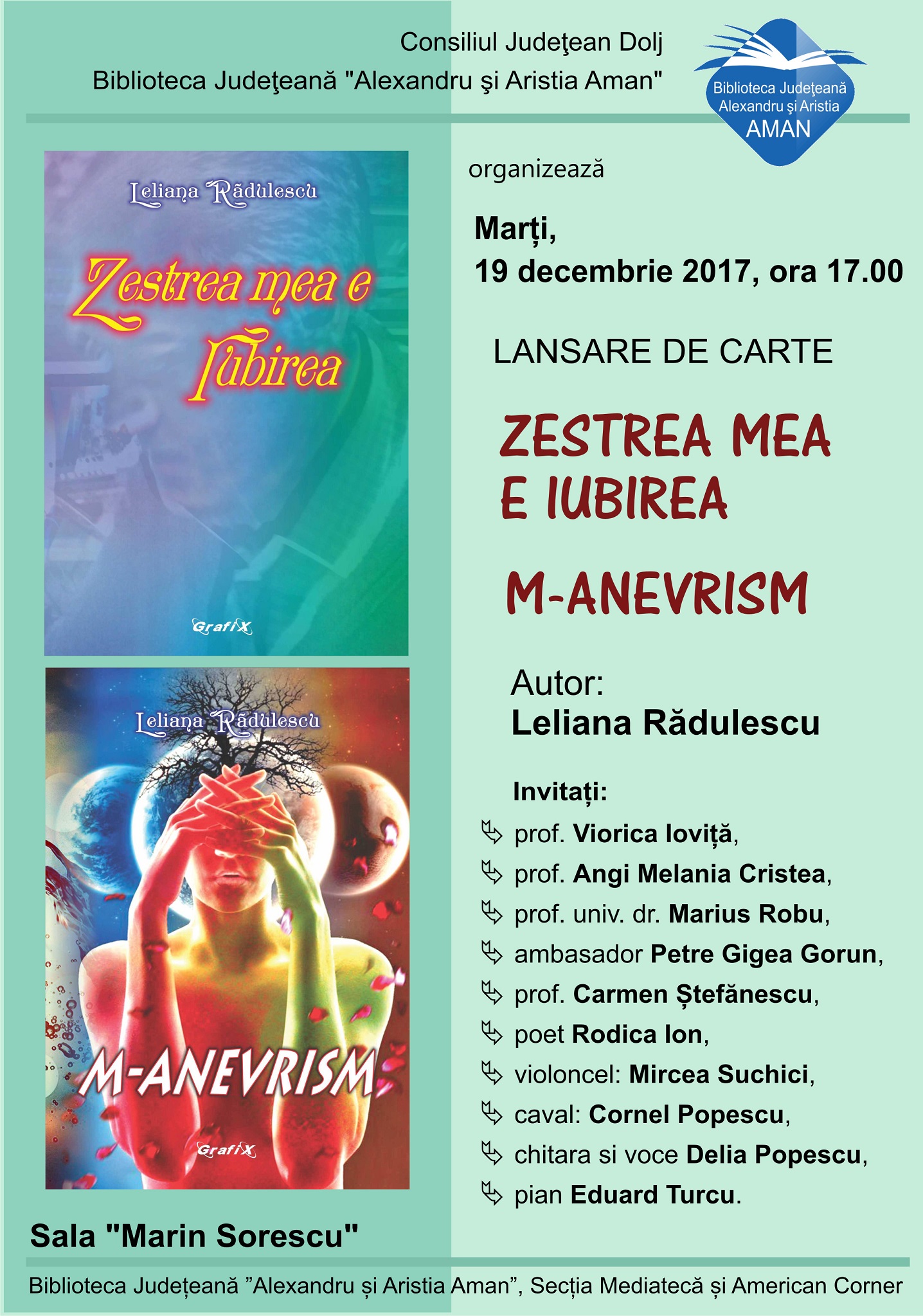 Biblioteca Județeană “Alexandru și Aristia Aman” organizează marți, 19 decembrie 2017, începând cu ora 17.00, lansarea volumelor „Zestrea mea e iubirea” și “M-anevrism”, autor Leliana Rădulescu.