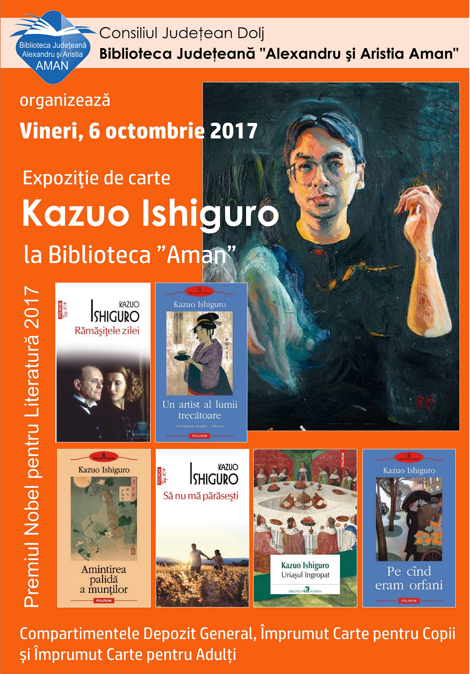 Biblioteca Județeană ”Alexandru și Aristia Aman” organizează astăzi, în compartimentele Depozit General, Împrumut Carte pentru Copii și Împrumut Carte pentru Adulți, o expoziție de carte dedicată scriitorului britanic de origine japoneză Kazuo Ishiguro.