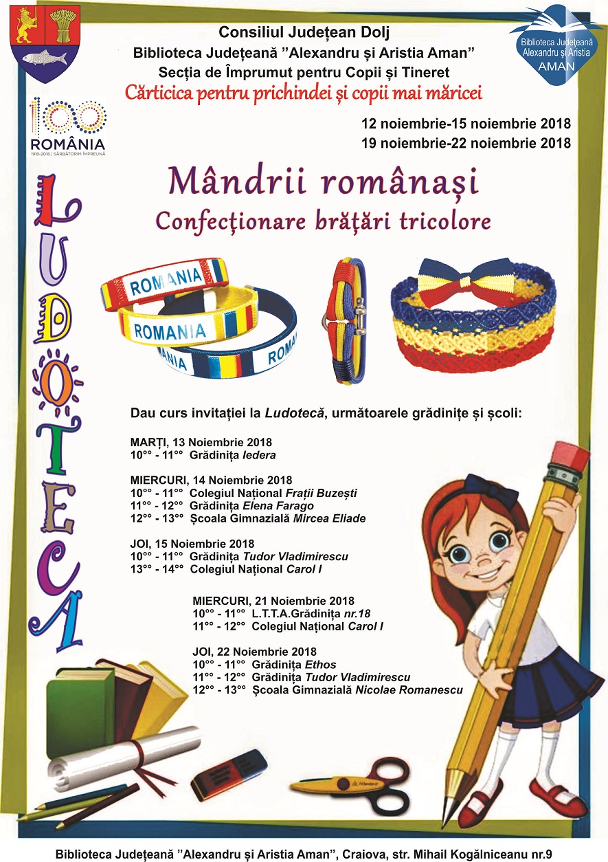 Biblioteca Județeană „Alexandru și Aristia Aman” organizează, în intervalele 12 – 25 și 19 – 22 noiembrie, în cadrul proiectului „Cărticica pentru prichindei și copii mai măricei”, acțiunea cu titlul „Mândrii românași-confecționare brățări tricolore”.