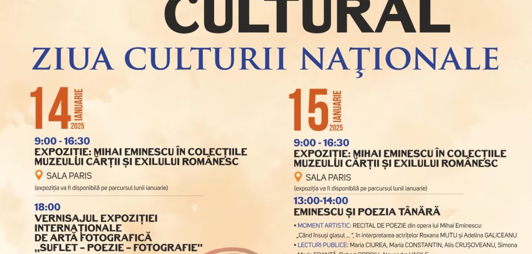 Muzeul Cărții și Exilului Românesc celebrează Ziua Culturii Naționale, prin organizarea în zilele de 14 și 15 ianuarie 2025, a evenimentului intitulat Maraton Cultural la Muzeul Cărții și Exilului Românesc – Ziua Culturii Naționale.