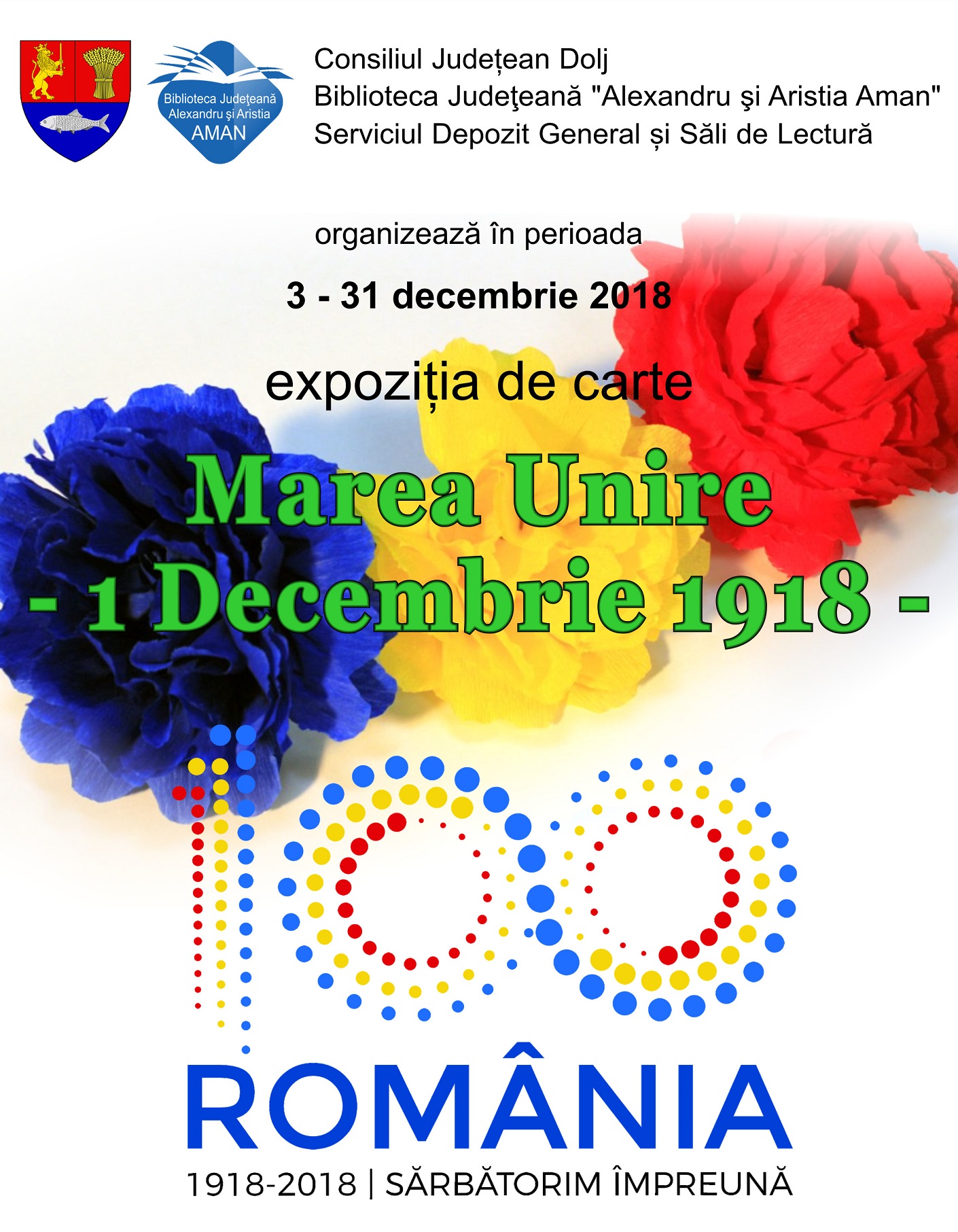 Biblioteca Județeană „Alexandru și Aristia Aman” organizează, în intervalul 3 – 31 decembrie 2018, în sala „Acad. Dinu C. Giurescu”, expoziția de carte cu titlul „Marea Unire – 1 Decembrie 1918”.