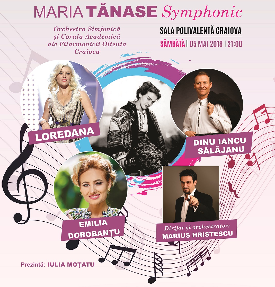 Maria Tănase Symphonic, cel mai important eveniment al primăverii, organizat de Filarmonica Oltenia Craiova, este un spectacol de fuziune cu orchestraţii simfonice, pornind de la melodiile legendarei interprete de folclor autentic românesc, Maria Tănase! Este un impresionant omagiu dedicat doamnei cântecului românesc, acordurile muzicii clasice rezonând cu frumusețea melodică autohtonă. Nu întâmplător, evenimentul se desfăşoară în acest an, 2018, în care aniversăm împlinirea unui secol de la înfăptuirea Marii Uniri. Cea care a fost supranumită „pasărea măiastră” este un simbol al spiritului românesc, aşa cum ne-a fost transmis prin frumoasele cântece strămoşeşti.