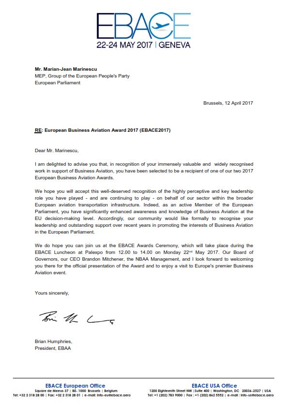Marian Jean Marinescu a fost invitat la ceremonia de decernare a premiului oferit de Industria Europeana a Aviației Business in Geneva (Elveția) pe data de 22 mai 2017.