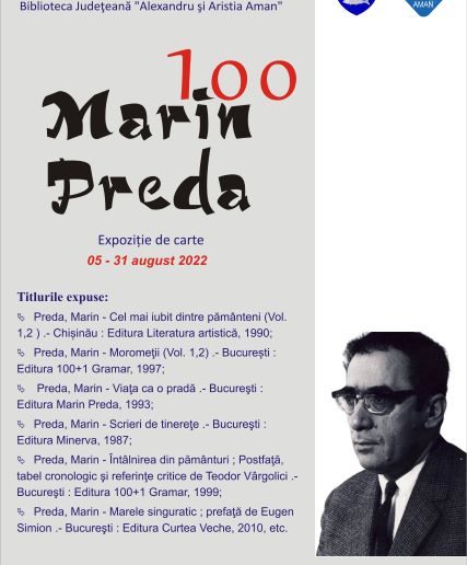În perioada 5 – 31 august 2022, în salonul Expozițional de la parterul instituției, vor fi expuse volume ale scriitorului Marin Preda, din fondul de carte al Bibliotecii Județene „Alexandru și Aristia Aman”.