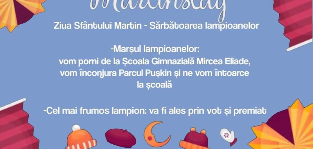 Vineri, 10 noiembrie 2023 începând cu ora 18:00 elevii Școlii Gimnaziale “Mircea Eliade” însoțiți de profesori vor face un marș al lampioanelor pornind din curtea școlii, înconjurând Părculețul Pușkin și revenind în curtea școlii, unde va fi votat și premiat cel mai frumos lampion realizat de copii.