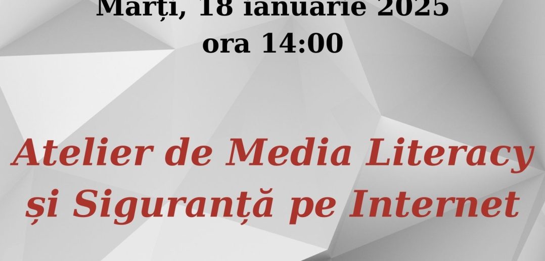 Județeană „Alexandru și Aristia Aman”, prin secția Mediatecă și American Corner Craiova organizează marți, 18 februarie, orele 14:00 un atelier de „Media Literacy și Siguranță pe Internet”. La eveniment vor participa elevii clasei a V-a B de la Colegiul Național Pedagogic „Ștefan Velovan”, coordonați de profesorii: Maria-Mădălina Poiană și Elena Marinova.
