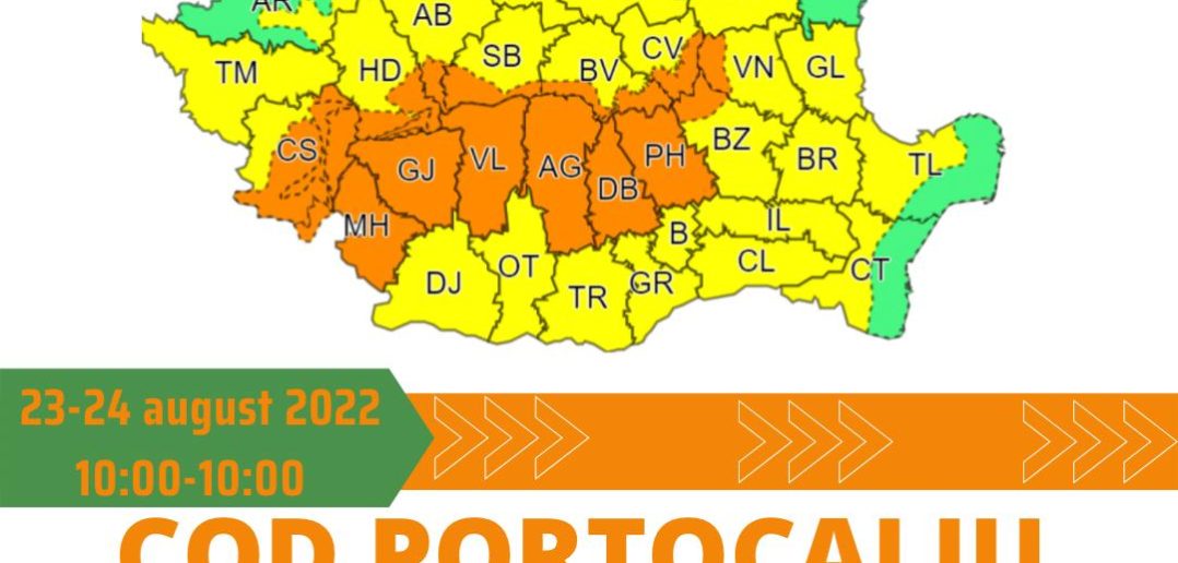 Începând de azi, 23 august, până mâine, 24 august, ora 10:00, județul Mehedinți se va afla sub incidența avertizării meteorologice COD PORTOCALIU de ploi abundente, conform informării transmise de către Administrația Națională de Meteorologie.