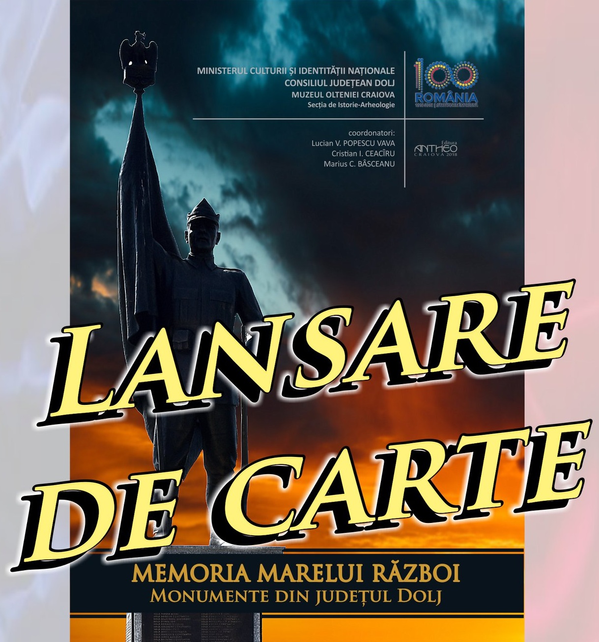 Cu ocazia aniversării a 104 ani (1 Aprilie 1915 – 1 Aprilie 2019) de la înființarea Muzeului Olteniei Craiova, avem onoarea să vă invităm marți, 2 aprilie 2019, începând cu ora 11.00, la sediul Secţiei de Istorie-Arheologie (Corpul Nou), din str. Madona Dudu nr. 14, la lansarea albumului intitulat “Memoria Marelui Război. Monumente din județul Dolj”.