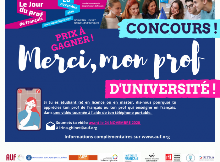 Studenţii au intrat în concurs cu înregistrări video de 3 minute în care îşi exprimau opinia şi gratitudinea pentru un profesor de limba franceză. Profesorii de limba și literatura franceză de la Universitatea din Craiova, cărora li se adresează aceste mesaje emoționante şi cu totul surprinzătoare sunt: lect. univ. dr. Marinella Coman, conf. univ. dr. Camelia Manolescu, lect. univ. dr. Valentina Rădulescu, precum și Laura Wantzenrieder, lector de limba franceză la Universitatea din Craiova în perioada 2018-2019.