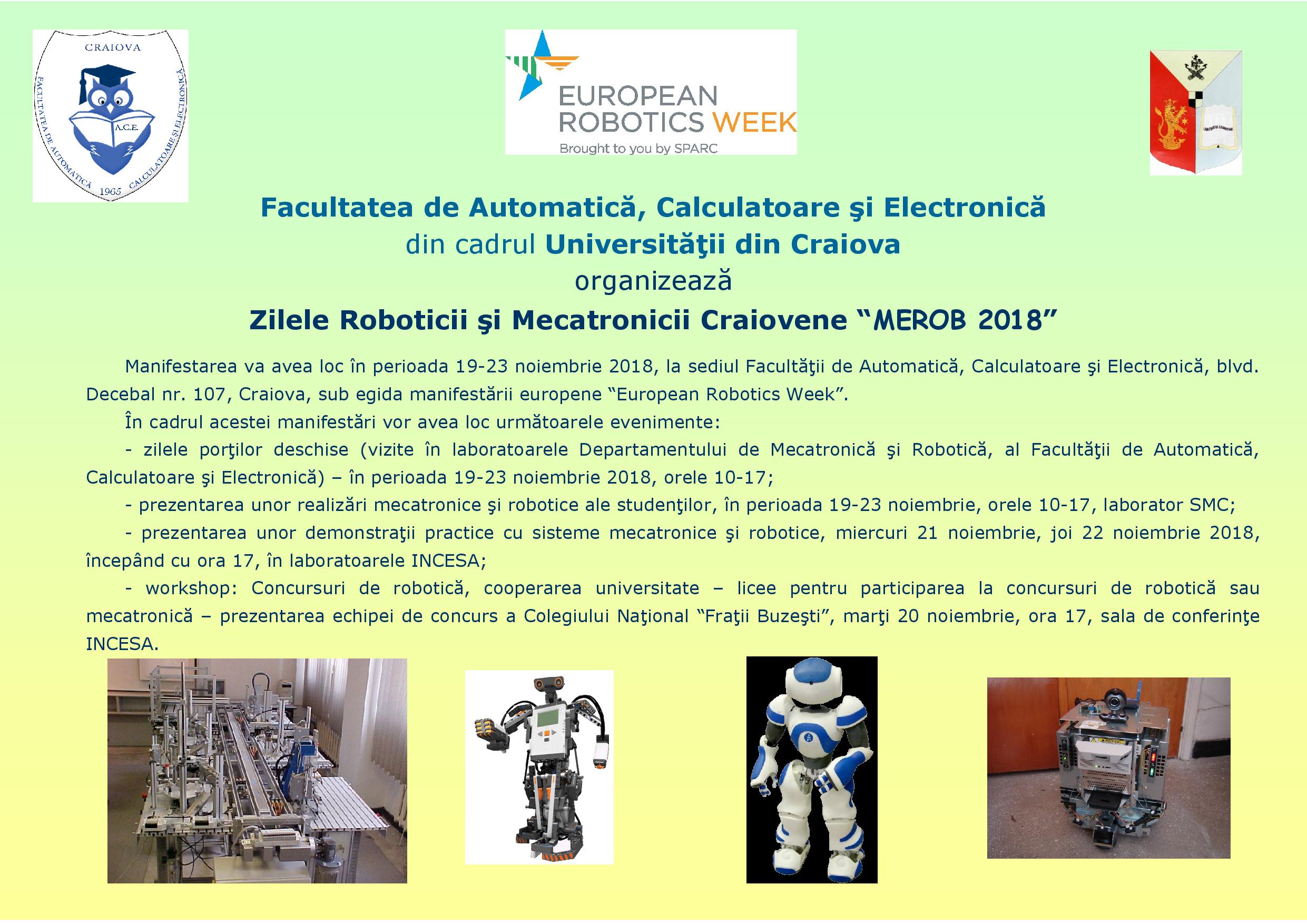 În perioada 19-23 noiembrie 2018, la Facultatea de Automatică, Calculatoare şi Electronică, Departamentul de Mecatronică şi Robotică organizează Zilele Roboticii şi Mecatronicii Craiovene „MEROB 2018”.