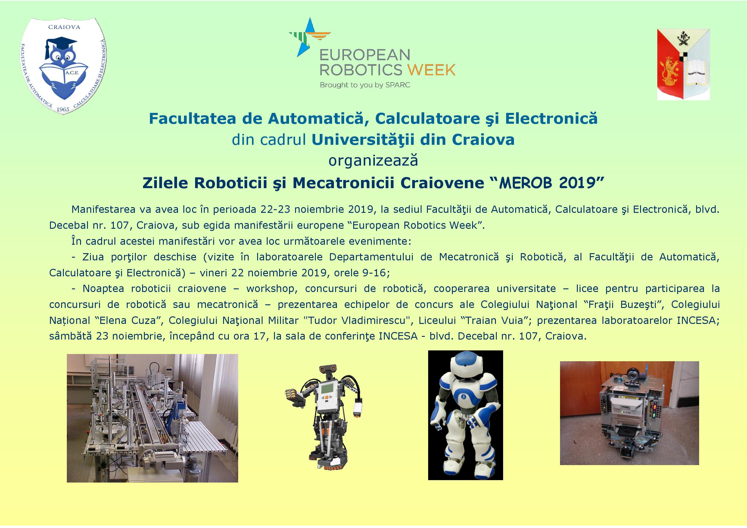 În perioada 22-23 noiembrie 2019, la sediul Facultăţii de Automatică, Calculatoare şi Electronică (Universitatea din Craiova), Departamentul de Mecatronică şi Robotică organizează Zilele Roboticii şi Mecatronicii Craiovene „MEROB 2019”. Programul, inclus în „European Robotics Week”, reuneşte „Ziua porţilor deschise” (vineri) şi Noaptea roboticii craiovene (sâmbătă).