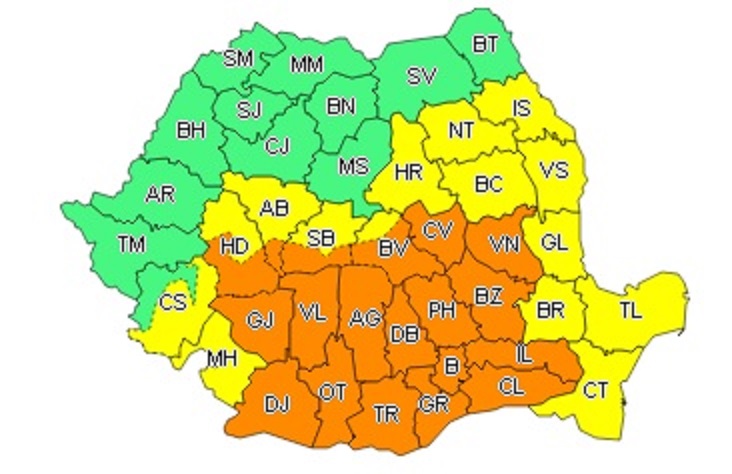 Codul va fi prelungit din această dimineață, începând cu ora 10,00 până marți dimineață la aceeași oră. În intervalul menţionat, vor fi averse ce vor avea şi caracter torenţial, pe parcursul zilei de luni (3 iulie) mai ales în Oltenia, Muntenia, sudul Banatului şi local în Transilvania şi Moldova, iar noaptea, cu precădere în Dobrogea, cea mai mare parte a Munteniei şi în sudul Moldovei. Ploile vor fi însoţite de descărcări electrice, intensificări ale vântului şi izolat grindină. În intervale scurte de timp sau prin cumulare, în județele Gorj, Vâlcea, Dolj, Olt, Argeș, Dâmbovița, Prahova, Buzău, Covasna, Vrancea, Teleorman, Giurgiu, Ilfov, Ialomița și Călărași, în municipiul București și în zona de munte a județelor Hunedoara, Alba, Sibiu, Brașov se vor înregistra cantităţi de apă de 50…70 l/mp şi pe arii restrânse peste 80…90 l/mp, îndeosebi în județele Teleorman, Giurgiu, Olt, Argeș și Vâlcea.