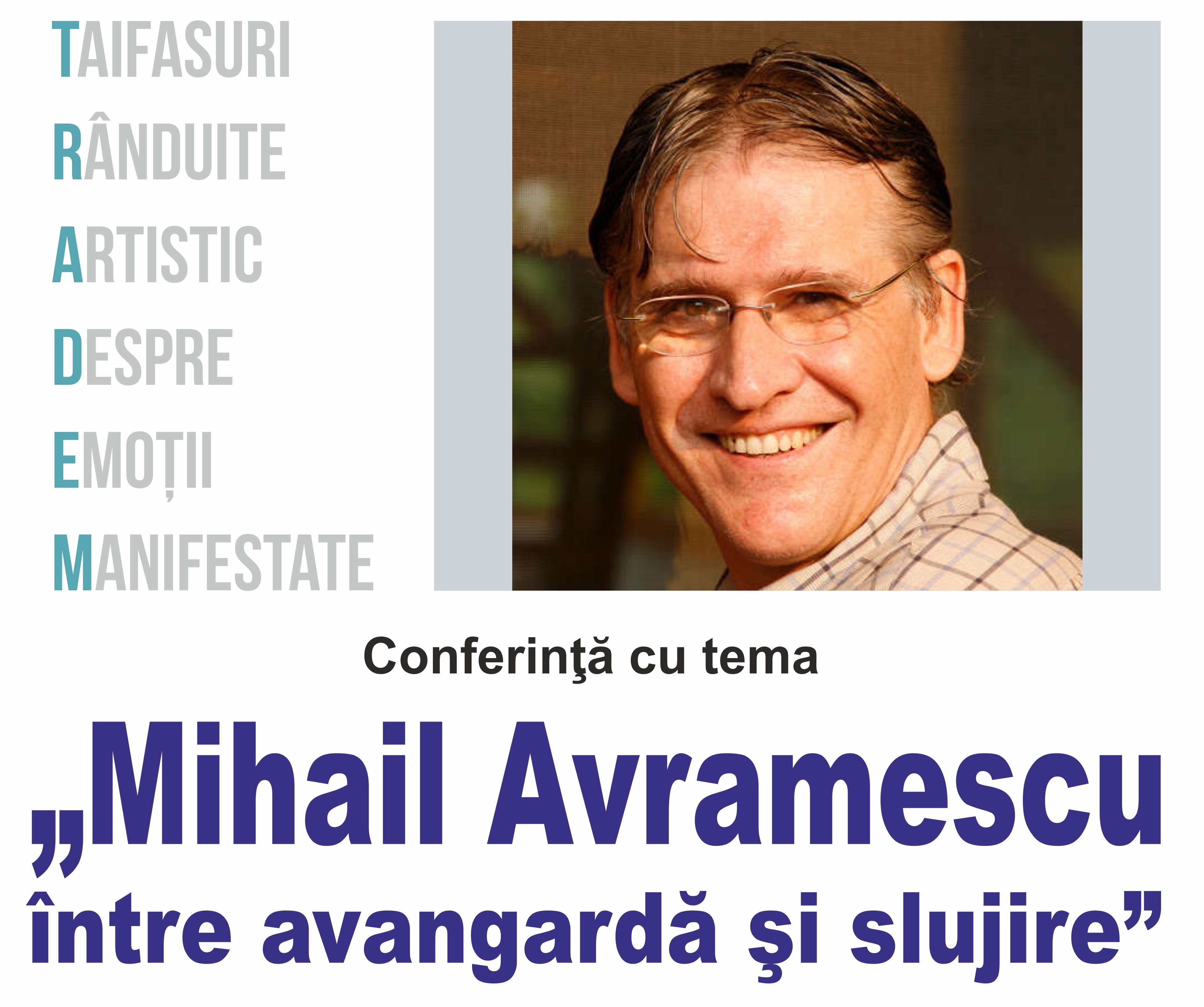 Vineri, 21 aprilie, ora 18.00, în cadrul proiectului TRADEM (Taifasuri Rânduite Artistic de Emoții Manifestate), vă invităm la conferința „Mihail Avramescu între avangardă şi slujire”, susținută de Marcel Tolcea. Conferința va avea loc, ca de obicei, în Salonul Medieval al Casei de Cultură „Traian Demetrescu”, iar Petrișor Militaru şi Adrian Bodnaru vor vorbi în deschidere despre opera şi personalitatea lui Marcel Tolcea. Întâlnirea este moderată de Maria Dinu, iar intrarea la eveniment este liberă.