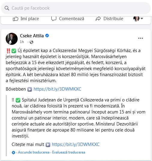Attila Cseke, ministru al Dezvoltării și Administrației Publice în GUVERNUL ROMÂNIEI!! comunică exclusiv în limba maghiară pe rețeaua de socializare (vezi foto!). Dacă vrei să afli, cumva, ce „vrea să spună autorul”, ghinion, cu ar zice președintele în funcție. Nici măcar traducerea pusă la dispoziție de către facebook nu te ajută. Nu de alta dar nu știi dacă, de exemplu, sau patinoarul din