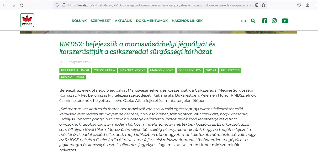 Numai că, ce să vezi, la respectivul link nu este asa cum te-ai aștepta, pagina Ministerului Dezvoltării ci … pagina UDMR!!! care este, bineînțeles, în limba maghiara. Dacă insiști, totuși, si încerci sa folosești butonul de schimbare a limbii … surpriza MATERIALUL DISPARE.