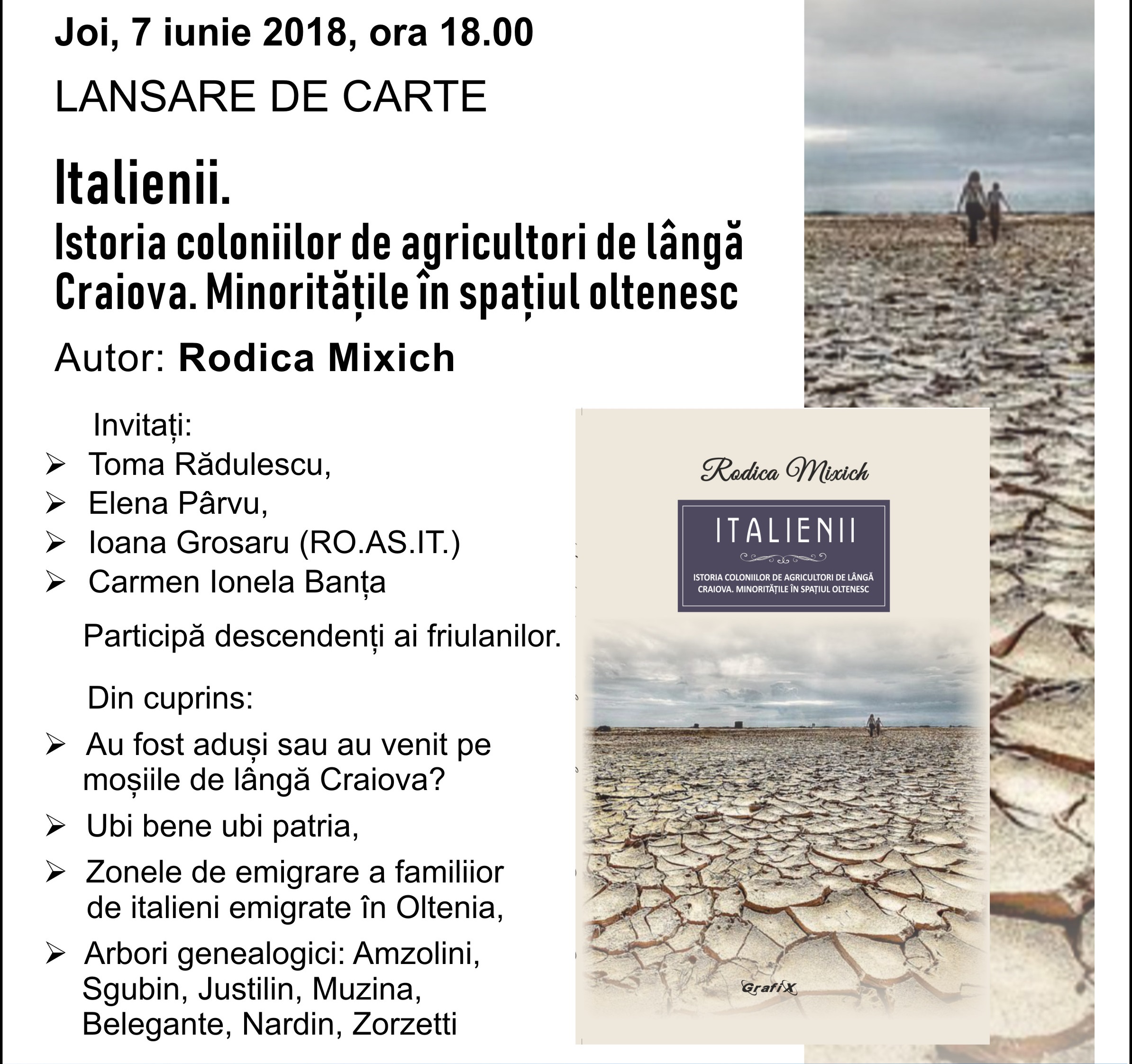 Biblioteca Judeţeană „Alexandru și Aristia Aman” organizează, joi, 7 iunie 2018, începând cu ora 18:00, în sala “Acad. Dinu C. Giurescu”, lansarea volumului “Italienii. Istoria coloniilor de agricultori de lângă Craiova. Minoritățile în spațiul oltenesc”, autor Rodica Mixich.