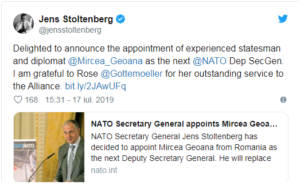 Anunțul a fost făcut chiar de către Jens Stoltenberg, secretarul general al NATO. Mircea Geoană o va înlocui în funcţie pe Rose Gottemoeller din SUA, care ocupa această poziţie din octombrie 2016.