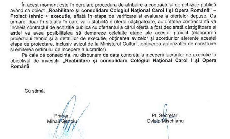 Este lamentabil că în acest oraş lucrurile nu funcţionează, pentru că unii, prin instituţii, se prefac că nu înţeleg ceea ce le cere comunitatea sau că întrebări fireşti sunt considerate instrumente de presiune. Ştiam că, într-adevăr, nu pot primi niciun document privind „cheltuielile”, pentru că deşi cunoaştem suma totală alocată proiectului, practic, la acest capitol nu s-au „cheltuit” decât vorbe. Restul au fost mărunţişuri care nu au făcut din clădire una mai puţin periculoasă. Era normal să nu ai cheltuieli, dacă te caracterizează doar un debit verbal şi zero debut. Am vrut doar să se recunoască, să eliminăm o stare generală de confuzie. În acest fragment din răspunsul oficial este foarte clar că primarul Craiovei nu are nicio soluţie pentru a salva acest colegiu devenit ruină şi că nu va face nimic în viitorul apropiat. Colegiul Carol a fost şi rămâne din păcate doar un pretext folosit şi de domnul Genoiu pentru a-şi creşte punctajul de popularitate. Dacă totuşi au fost oameni care „au îndrăznit să creadă” acum un an, cred că este timpul să îndrăznească şi domnul Genoiu să îşi justifice funcţia prin fapte. Îmi reamintesc celebra sa declaraţie legată de inaugurarea stadionului, cum că „nu data contează”, dar este nedrept ca la sfârşitul mandatului să lase moştenire craiovenilor doar o grămadă de proiecte neterminate.