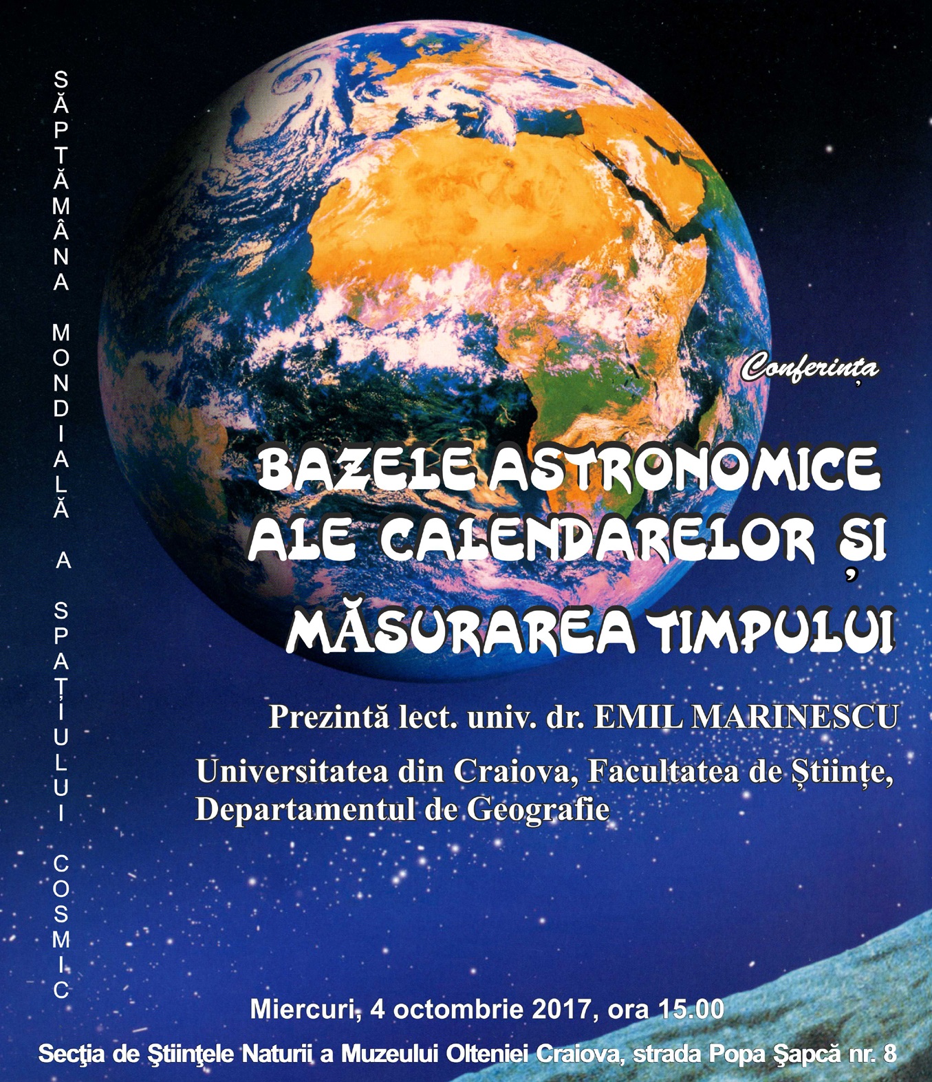 Secţia de Ştiinţele Naturii a Muzeului Olteniei Craiova continuă seria manifestărilor înscrise în cadrul proiectului cultural-educativ „Muzeul – o şcoală altfel”, cu organizarea Conferinței “Bazele astronomice ale calendarelor și măsurarea timpului”, ce va consta în videoproiecții susținute de lector univ. dr. Emil Marinescu de la Departamentul de Geografie din cadrul Facultăţii de Ştiinţe a Universităţii din Craiova.
