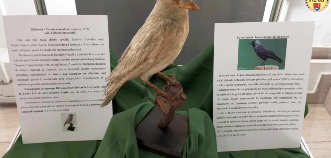 Publicul craiovean este invitat, în perioada 01-29.02.2024, la Muzeul Olteniei Craiova – Secția de Științele Naturii, pentru a admira în expunere liberă – stăncuță cu albinism total, piesa clasată în categoria Tezaur a patrimoniului cultural național (P.C.N.) în anul 2020.