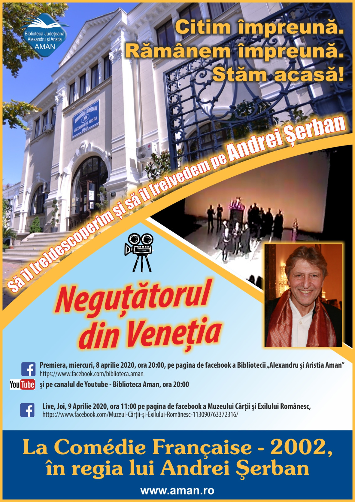 Piesa „Neguțatorul din Veneția” pusă în scenă la Paris va putea fi vizionată în premieră miercuri, 8 aprilie, la ora 20.00, pe pagina de Facebook a Bibliotecii Județene „Alexandru și Aristia Aman” și pe contul de Youtube – Biblioteca Aman, la aceeași oră, precum și joi, 9 aprilie 2020, la ora 11.00, pe pagina de Facebook a Muzeului Cărții și Exilului Românesc.