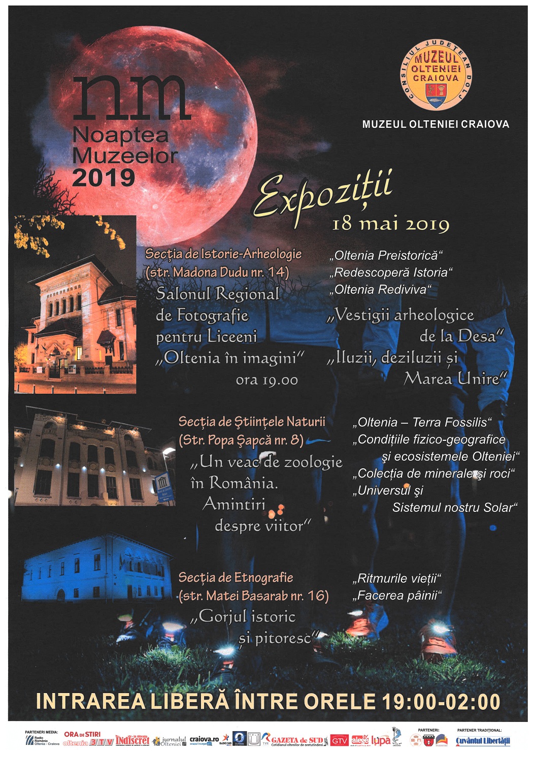 Evenimentul european Noaptea Muzeelor, editia a-XV-a, se va desfășura la Craiova, la Muzeul Olteniei, în ziua de sâmbătă, 18 mai 2019, în intervalul orar 19.00-02.00. Cu această ocazie, publicul vizitator va beneficia de accesul gratuit în toate cele trei locații expoziționale ale muzeului: Secția de Istorie-Arheologie (str. Madona Dudu, nr.14), Secția de Ștințele Naturii (str. Popa Șapcă, nr.8), Secția de Etnografie- Casa Băniei (str.Matei Basarab, nr.16).