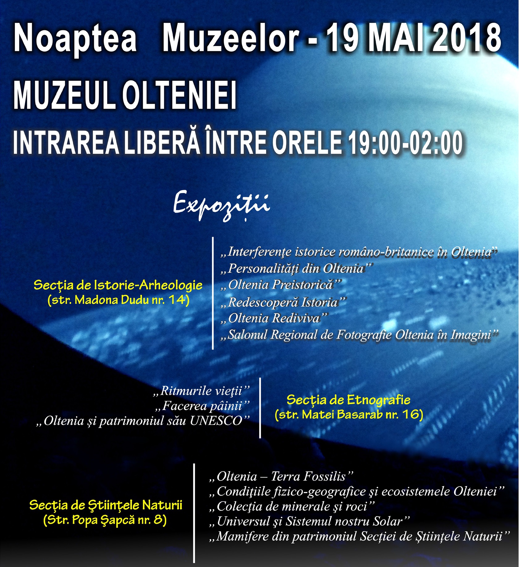 Muzeul Olteniei este unul dintre participanţii activi ai Ediției a XIV-a a evenimentului cultural “Noaptea Europeană a Muzeelor” (inițiat de către Ministerul Culturii și Comunicării din Franța), întâmpinându-şi vizitatorii în nocturnă cu un patrimoniu valoros şi diversificat, reprezentativ pentru dezvoltarea comunităţii locale, dar şi regionale, pe care îl va etala în toate cele trei locaţii expoziţionale din componența sa, respectiv: Secţia de Etnografie (str. Matei Basarab nr. 16), Secţia de Istorie-Arheologie (str. Madona Dudu nr. 14), Secţia de Ştiinţele Naturii (Str. Popa Şapcă nr. 8).