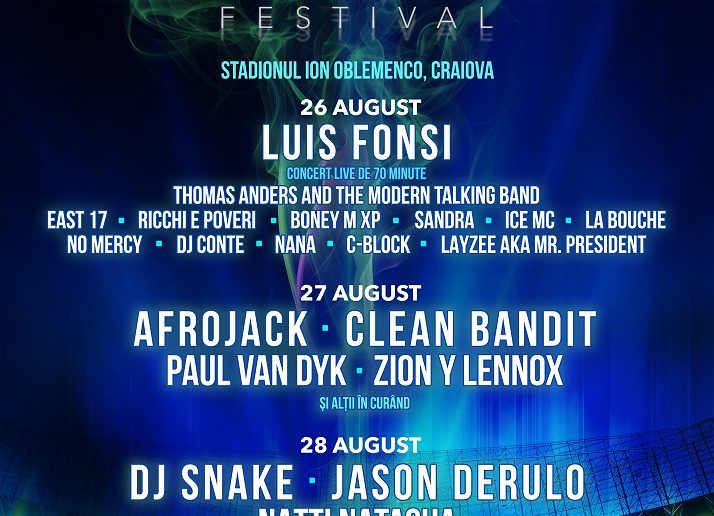 În prima seară de festival, artistul portorican LUIS FONSI, creatorul celebrului Despacito, care a înregistrat aproape 8 miliarde de vizualizări pe YouTube, va urca pe scena IntenCity, pentru un concert live de 70 de minute. Pe 26 august, publicul prezent la Craiova va avea ocazia să participe de asemenea la concertele unor îndrăgiți muzicieni ai anilor ’80 și ’90 – Thomas Anders and the Modern Talking Band, East 17, Ricchi e Poveri, Boney M. XP, Sandra, Ice MC, La Bouche, No Mercy, DJ Conte, Nana, C-Block, LayZee aka Mr. President.