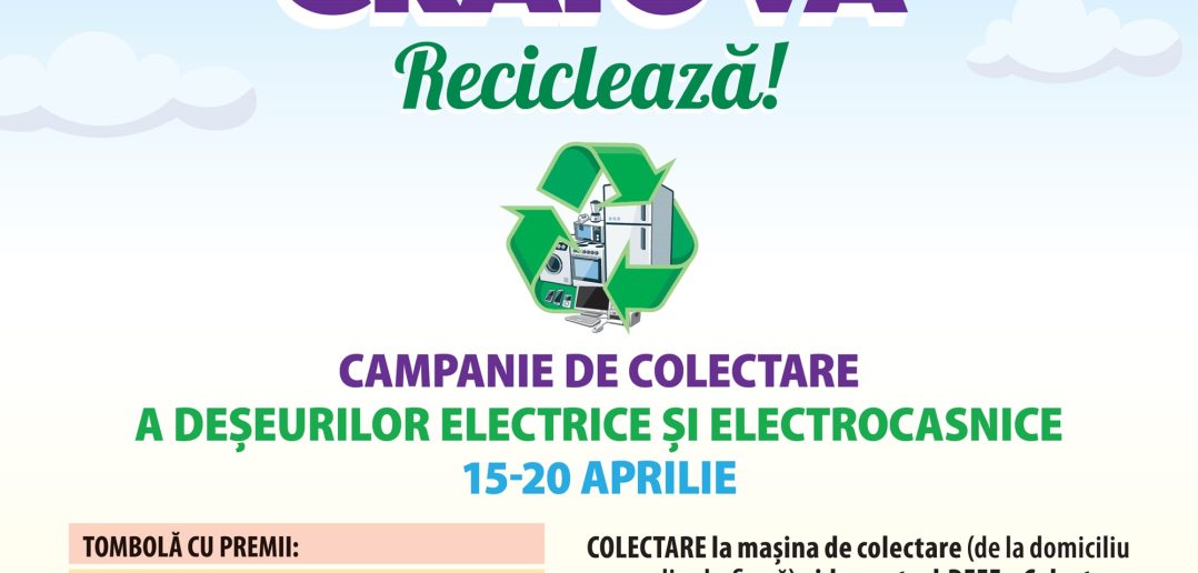 Primăria Municipiului Craiova, în parteneriat cu operatorul autorizat eColectare și OIREP Eco Positive, organizează în perioada 15 – 20 aprilie 2024, o nouă campanie de colectare gratuită a deșeurilor elecrice și electronice.