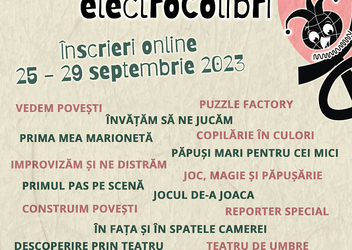 Înscrieri se fac în intervalul 25 – 29 septembrie 2023, doar prin formular on-line, link-urile pentru fiecare atelier în parte fiind disponibile din 25 septembrie, de la ora 00:01, până în data de 29 septembrie – ora 14:00 pe site-ul instituţiei: www.teatrulcolibri.ro şi pe paginile de facebook: AteliereleFabriciidePovestiElectroColibri/ și TeatrulColibri.