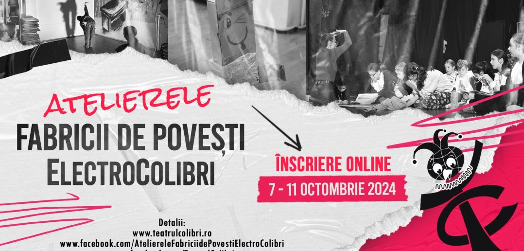 Înscrieri se fac în intervalul 07 – 11 octombrie 2024, doar prin formular on-line, link-urile pentru fiecare atelier în parte fiind disponibile din 07 octombrie, de la ora 09:00, până în data de 11 octombrie – ora 12:00 pe site-ul instituţiei: www.teatrulcolibri.ro şi pe paginile de facebook: AteliereleFabriciidePovestiElectroColibri/ și TeatrulColibri.