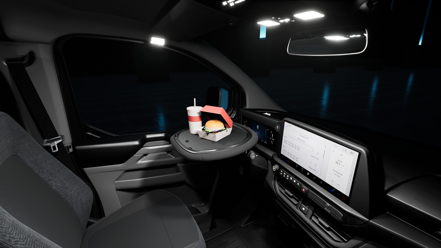 Pentru a maximiza productivitatea în timpul zilei de lucru, E-Transit Custom oferă noi soluții digitale pentru livrări multi-drop și acces facil la cabină și la compartimentul de încărcare. Cabina este, de asemenea, un centru de afaceri, cu conectivitate 5G și un spațiu de lucru flexibil, care include funcții inteligente precum un volan care se pliază pentru a deveni un suport ergonomic pentru laptopuri și tablete.