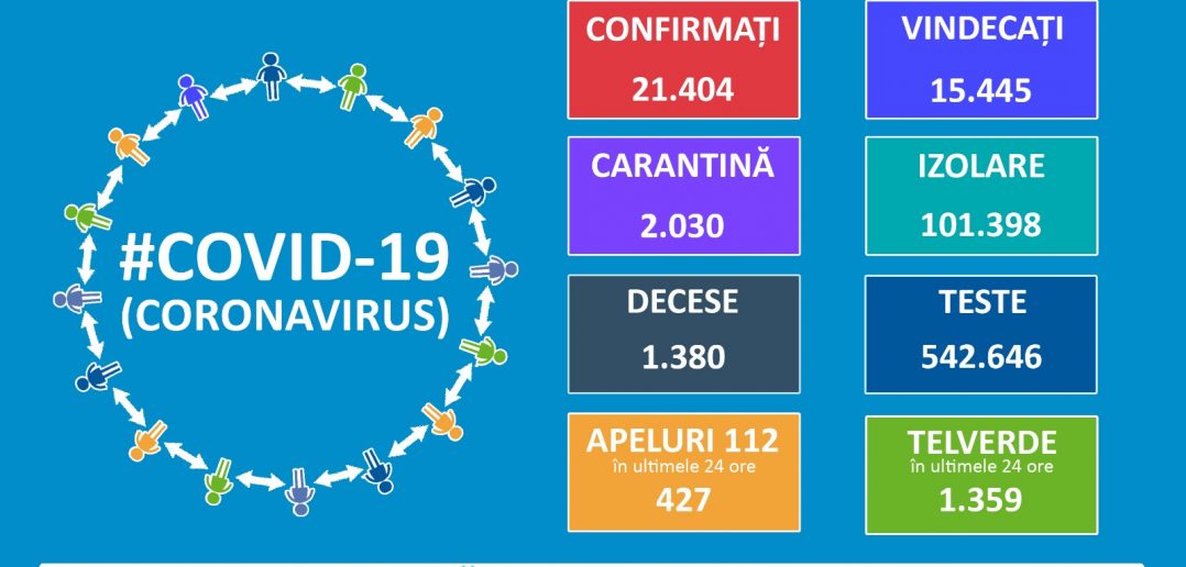 Pe teritoriul României au fost confirmate 21.404 de cazuri de persoane infectate cu virusul COVID – 19 (coronavirus). Dintre persoanele confirmate pozitiv, 15.445 au fost declarate vindecate și externate.