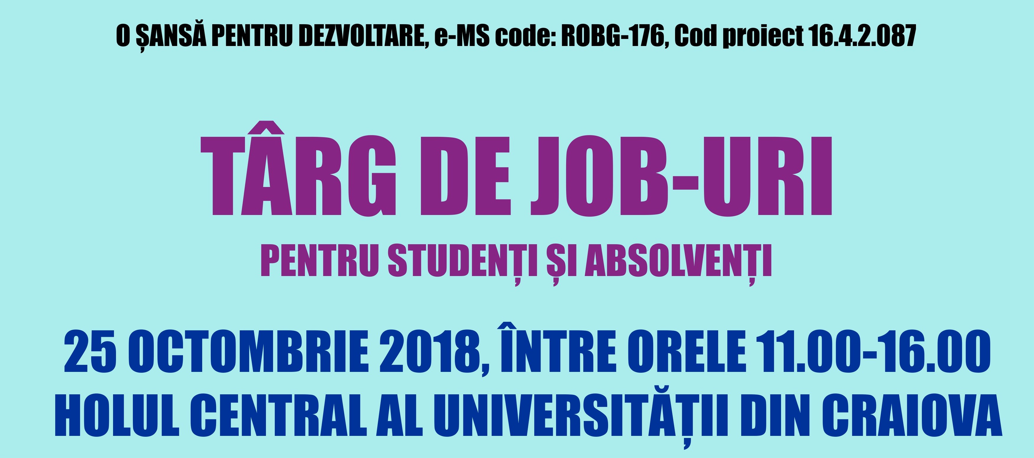 Conducerea Universității din Craiova alături de echipa de management a proiectului transfrontalier „O șansă pentru dezvoltare” vă invită la târgul de joburi pe 25 octombrie 2018, între orele 11:00-16.00, în Amfiteatrul 219 și holul central al Universității din Craiova. La târgul de joburi și-au anunțat participarea peste 15 firme, companii, institutii, banci, firme de recrutare.